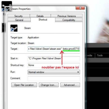 une fois que vous l'avez trouver cliquer droit dessus puis faite propriétés puis inserer cette commande pour ne pas prendre de risque faite copier coller inserer la commande comme sur la photo ci dessou: -beta gmod0718